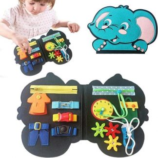 Knjiga od filca za malu djecu sadrži nekoliko scena iz svakodnevnog života, poput vezanja vezica, zakopčavanja gumba i zatvaranja patentnog zatvarača.