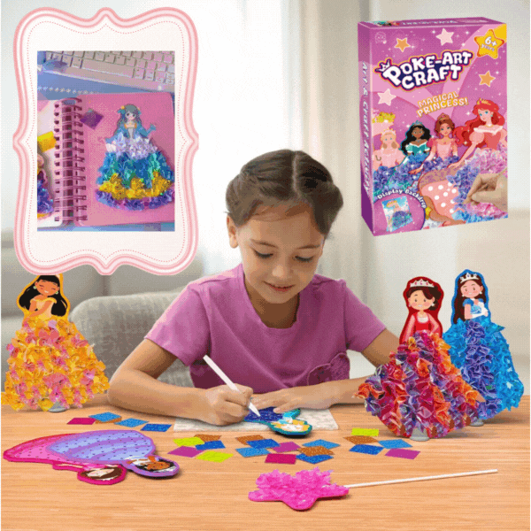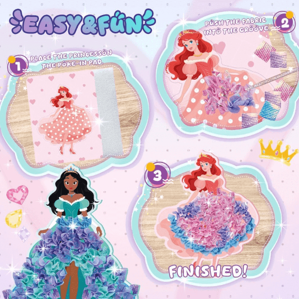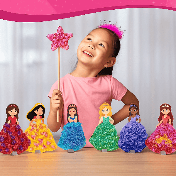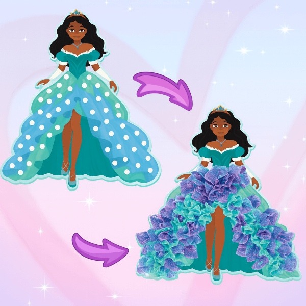 Djeca će s veseljem izrađivati svoje sjajne princeze bez ljepila, škara ili boja. Rezultat su prekrasne dekoracije na koje će biti ponosna.